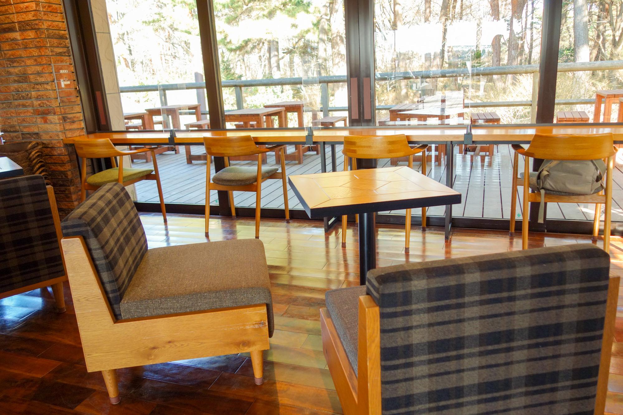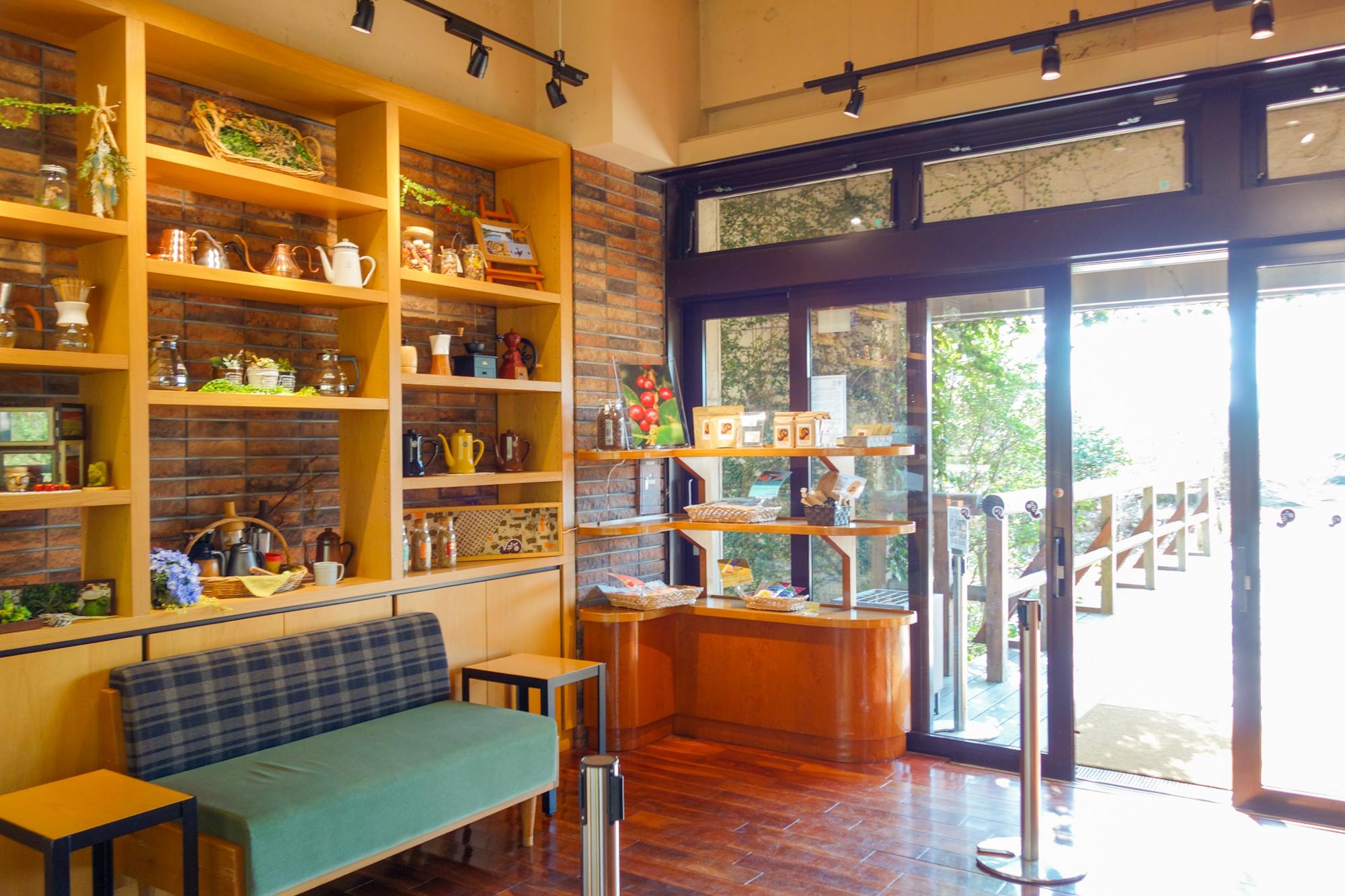 松林の中に降り注ぐ木漏れ日と、周囲に広がる記念の森散策路の花々に囲まれながら、オリジナルブレンドの珈琲や県産素材を使ったデザートなどを味わえます。平成29年にリニューアルオープン。