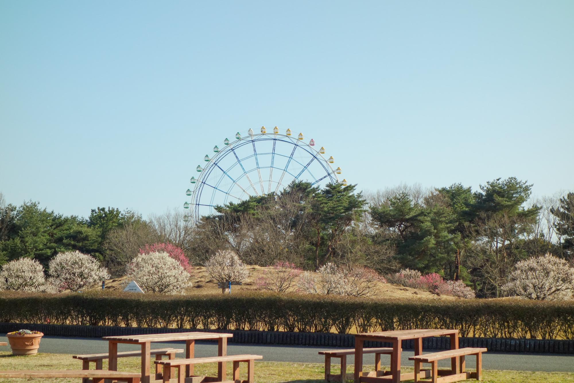 屋外のテラス席からは、見頃のウメやプレジャーガーデンの「大観覧車ブルーアイズ」が見えます。