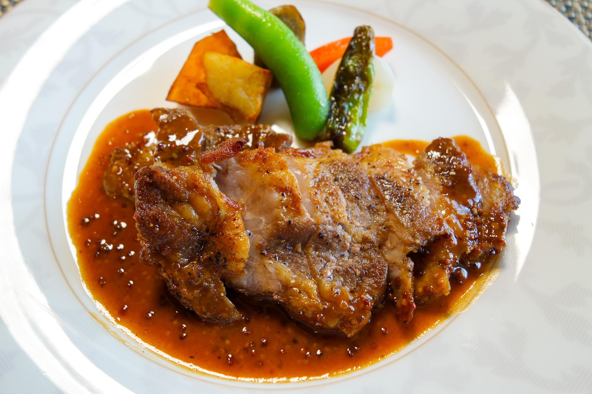 イベリコ豚のソテー。粒マスタードと赤ワインのソースがよく合います。