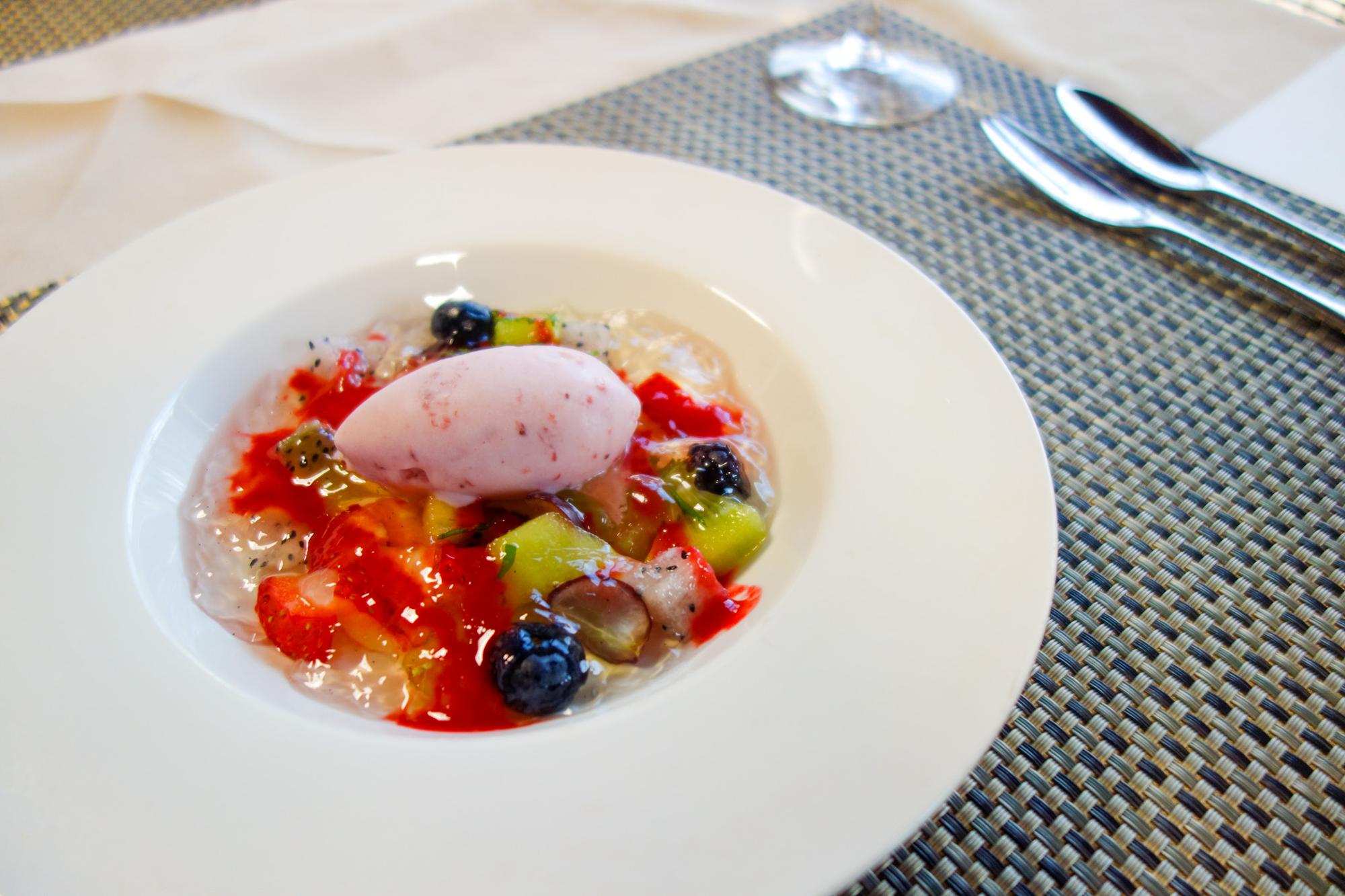 いちごアイスが乗ったフルーツのバニラジュレに、木いちごのソースが美しく映えます。