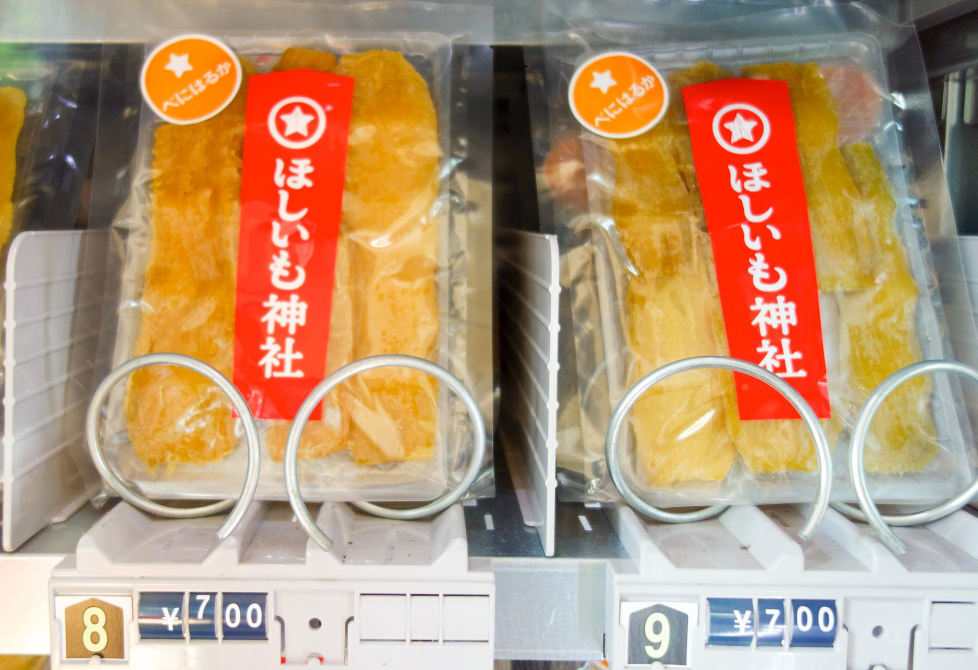 自販機では、黄金色のほしいもを含む4種類の商品が販売されています。ほしいもやお菓子の原料となるさつまいもは、すべて茨城県産。「ほしいもはここが一番おいしい」とわざわざ他県から買い求めに来る方も。