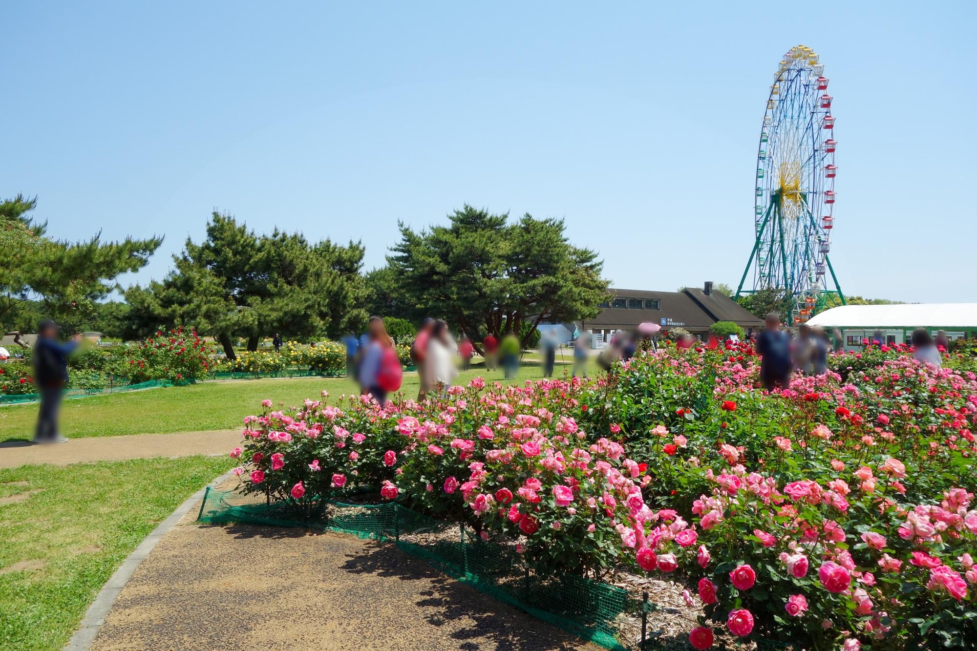 「ローズレリーフガーデン」自体が、バラの花形をモチーフにして作られています。隣接する大観覧車に乗ると、大きく花開いた「一輪のバラ」が浮かび上がってくる景色を楽しめます。