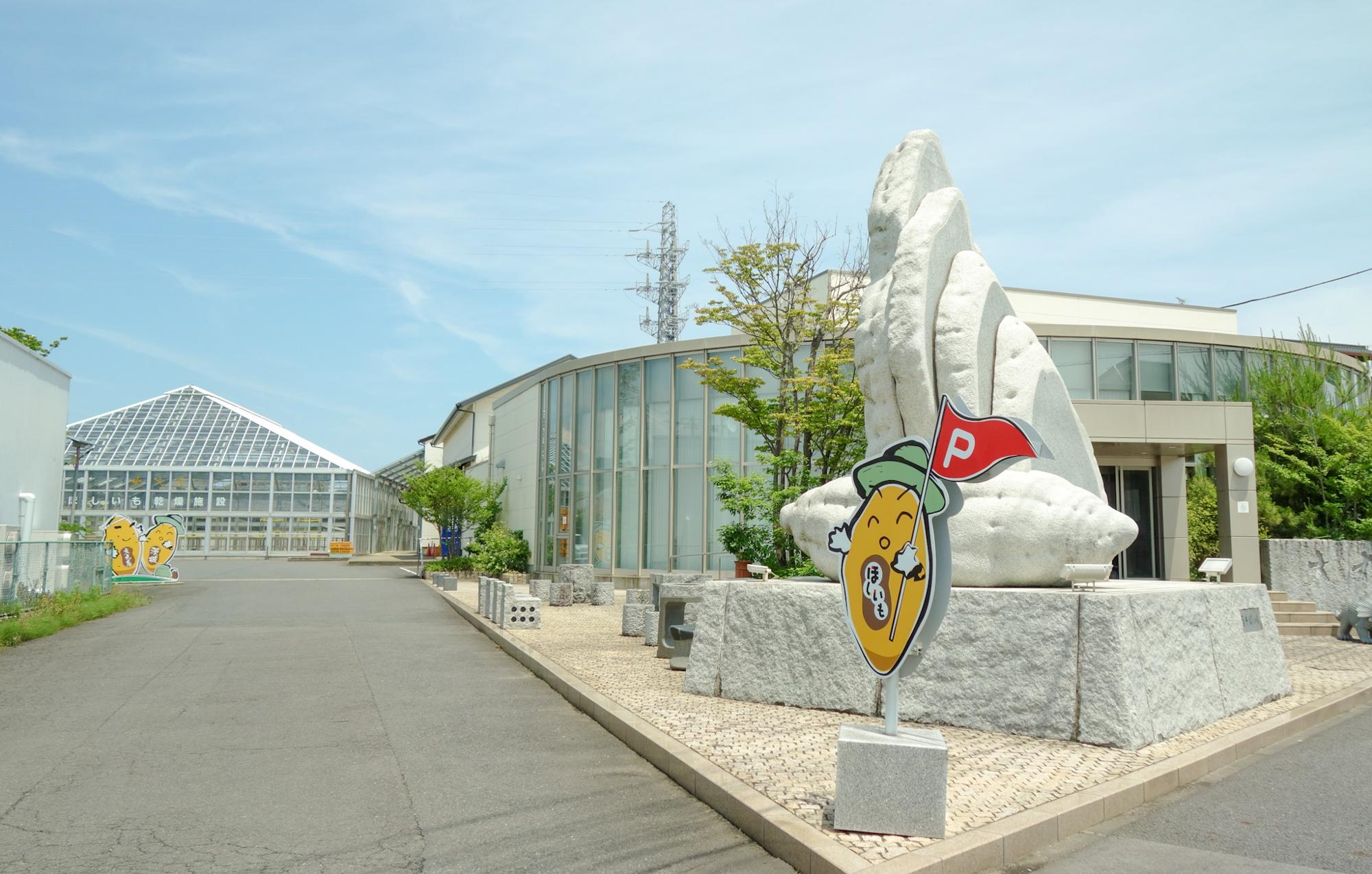 駐車場入口は、ほしいもの石造モニュメントの手前(勝田駅を背にした場合)。赤い旗をもっている黄色いほしいもの看板が目印です。
