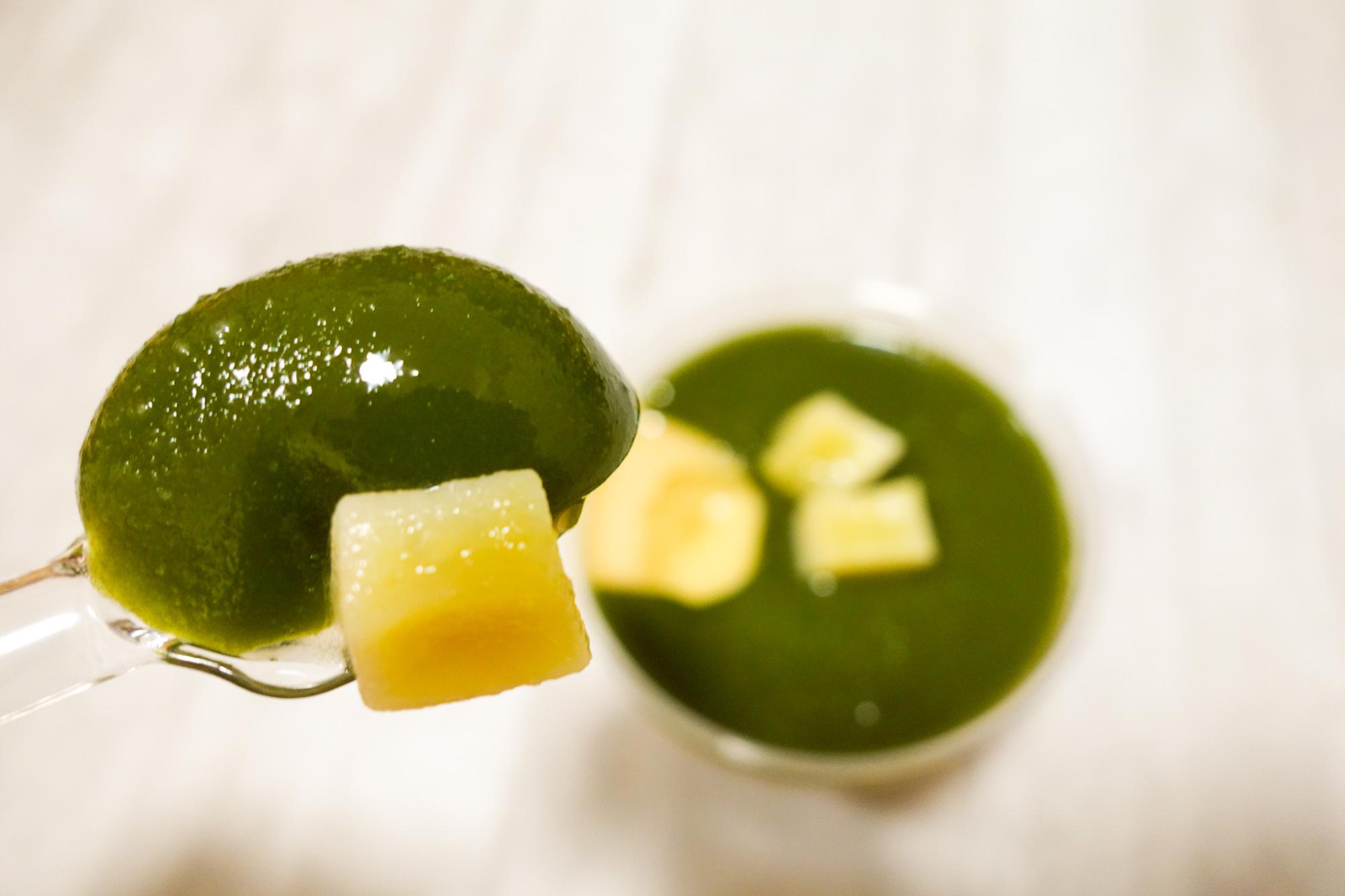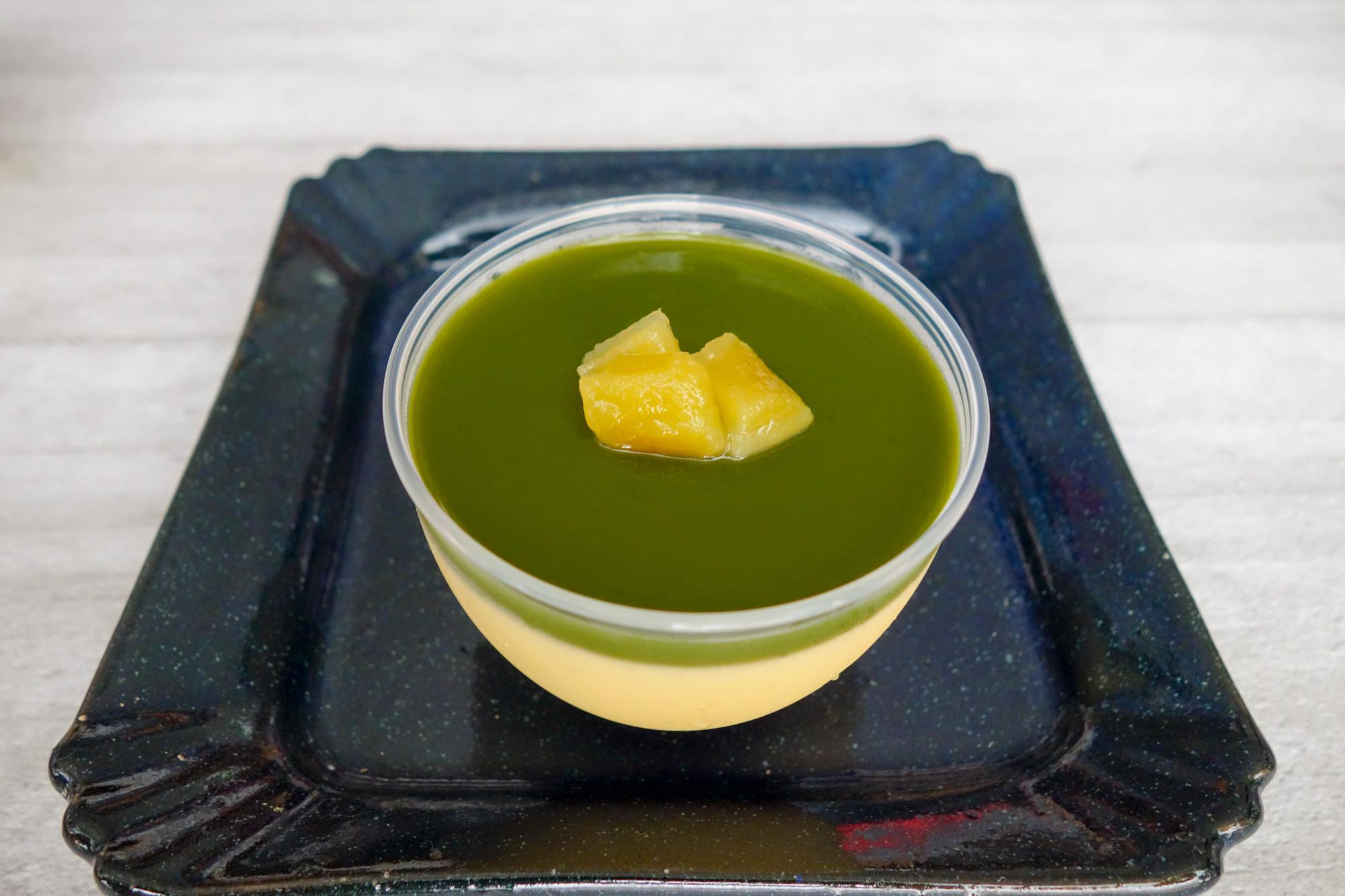 濃厚なお芋プリンに、茨城県産猿島茶ジュレと干し芋の甘露煮を乗せた初夏のプリンです。