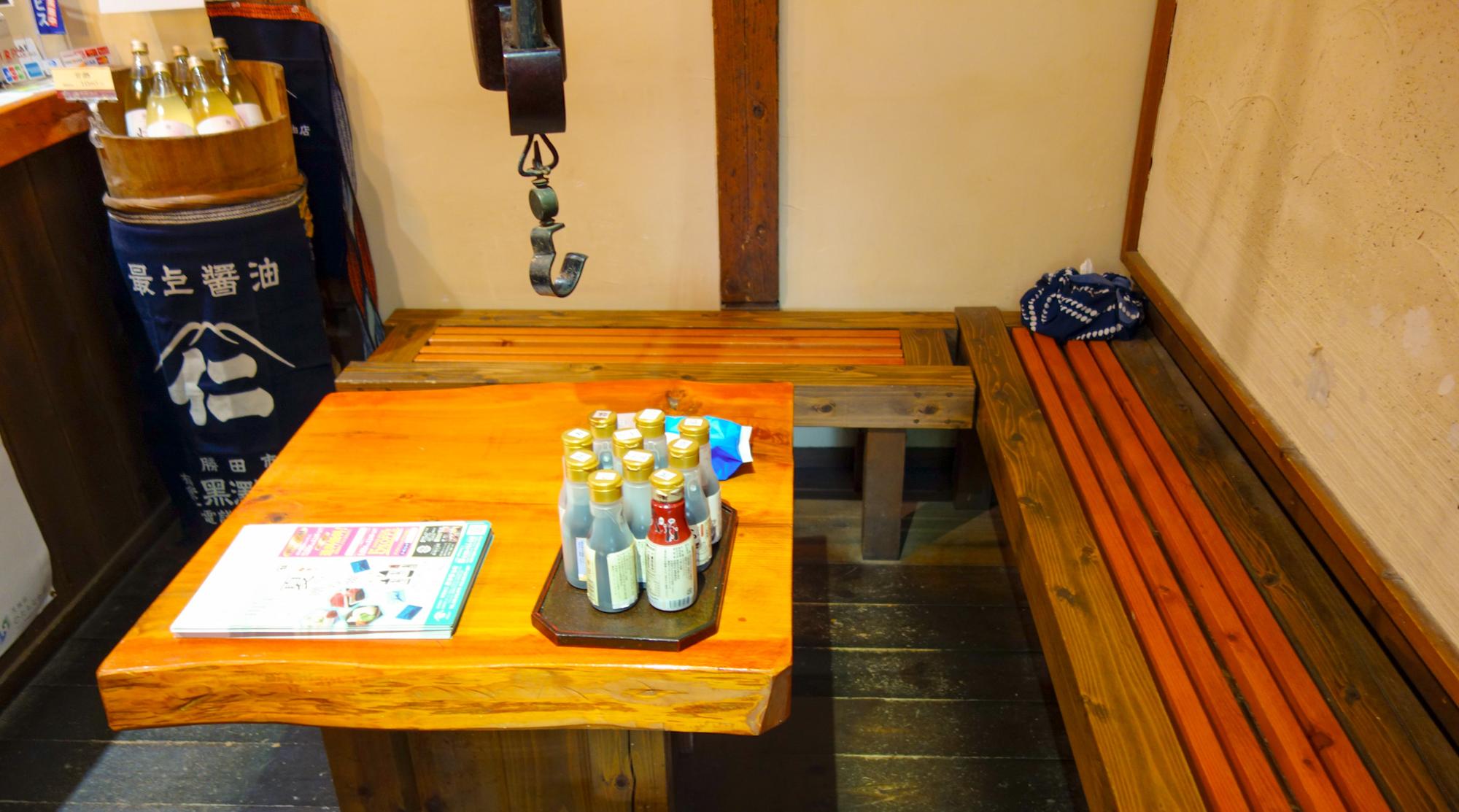 醬油蔵の“のれん”の文字(右奥)は、百周年の記念に、四代目のお子さんたちが書いたものだそうです。味わい深い作品から親子の絆が垣間見え、ほっこりします。
