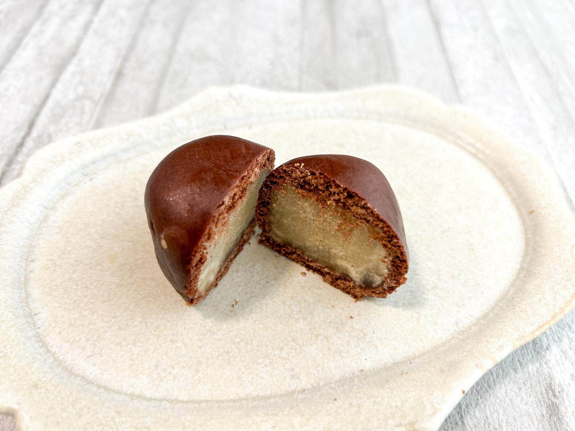 皮がチョコレートとココア風味で、中は白あんのやさしい甘さ。