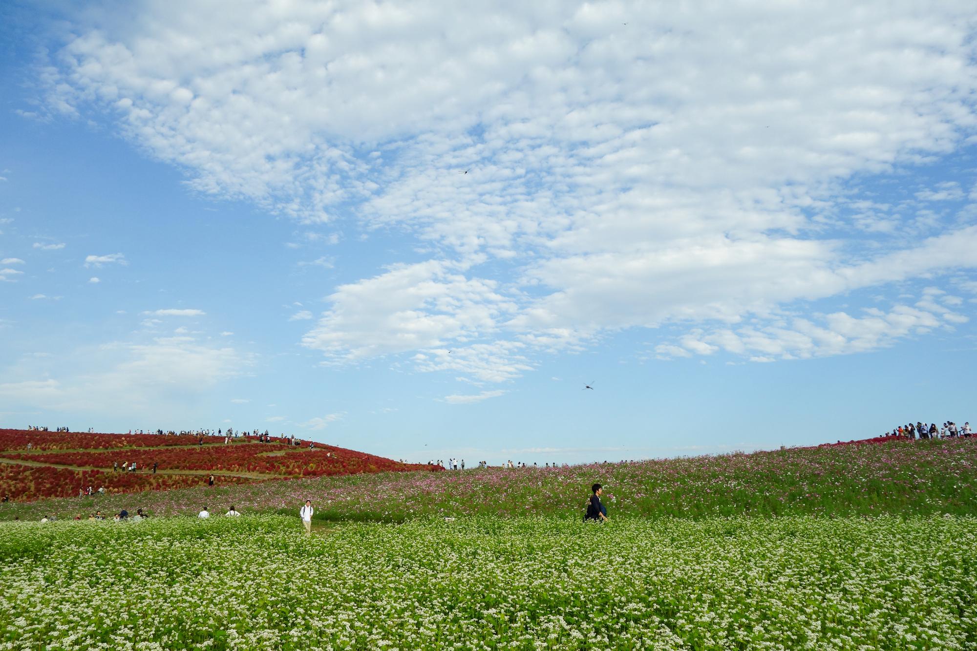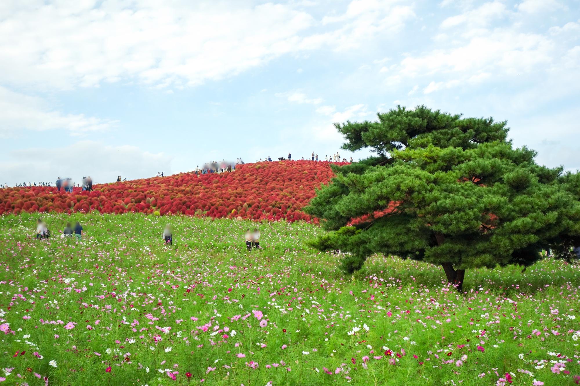 みはらしの丘へ着くと、見頃を迎えたコスモスとコキアが出迎えてくれます。