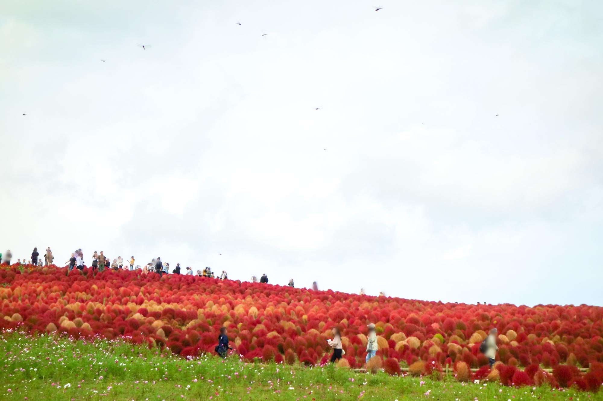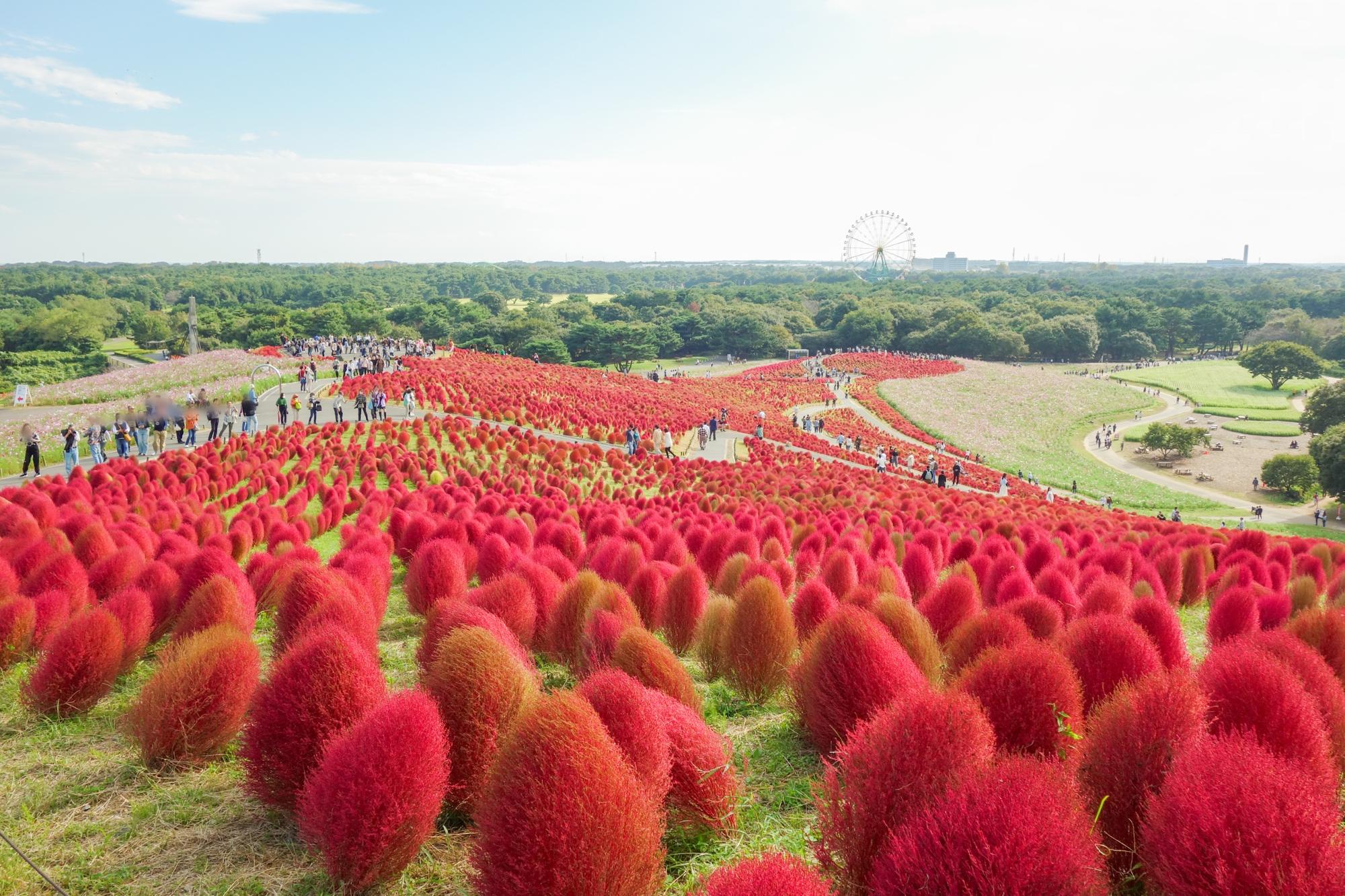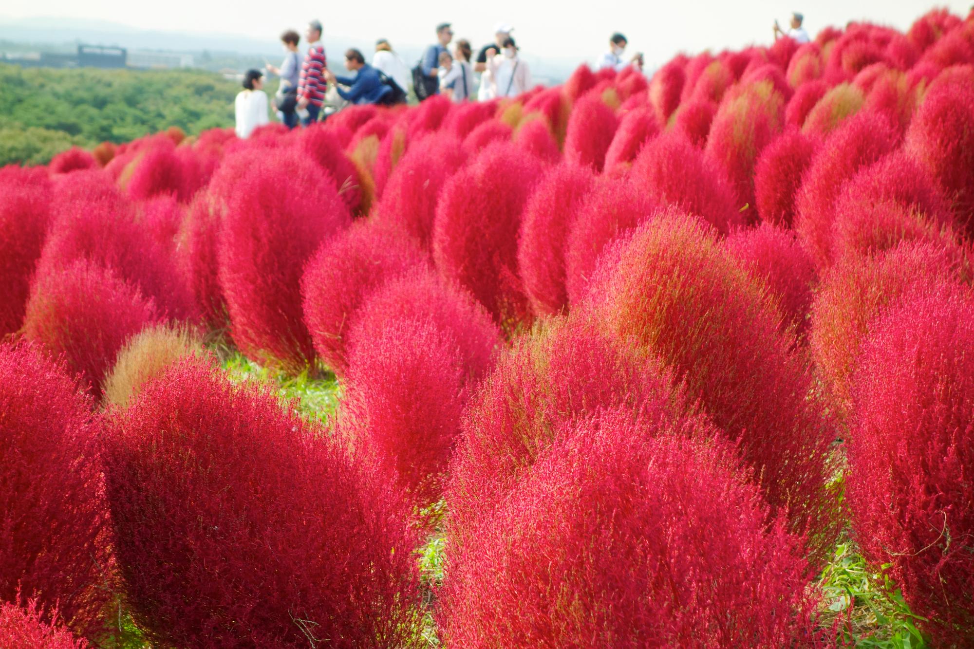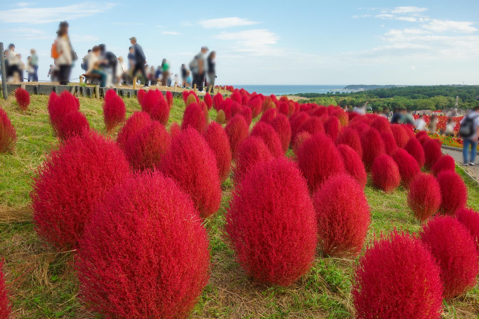 国営ひたち海浜公園では、コキアの紅葉が見頃を迎えています。