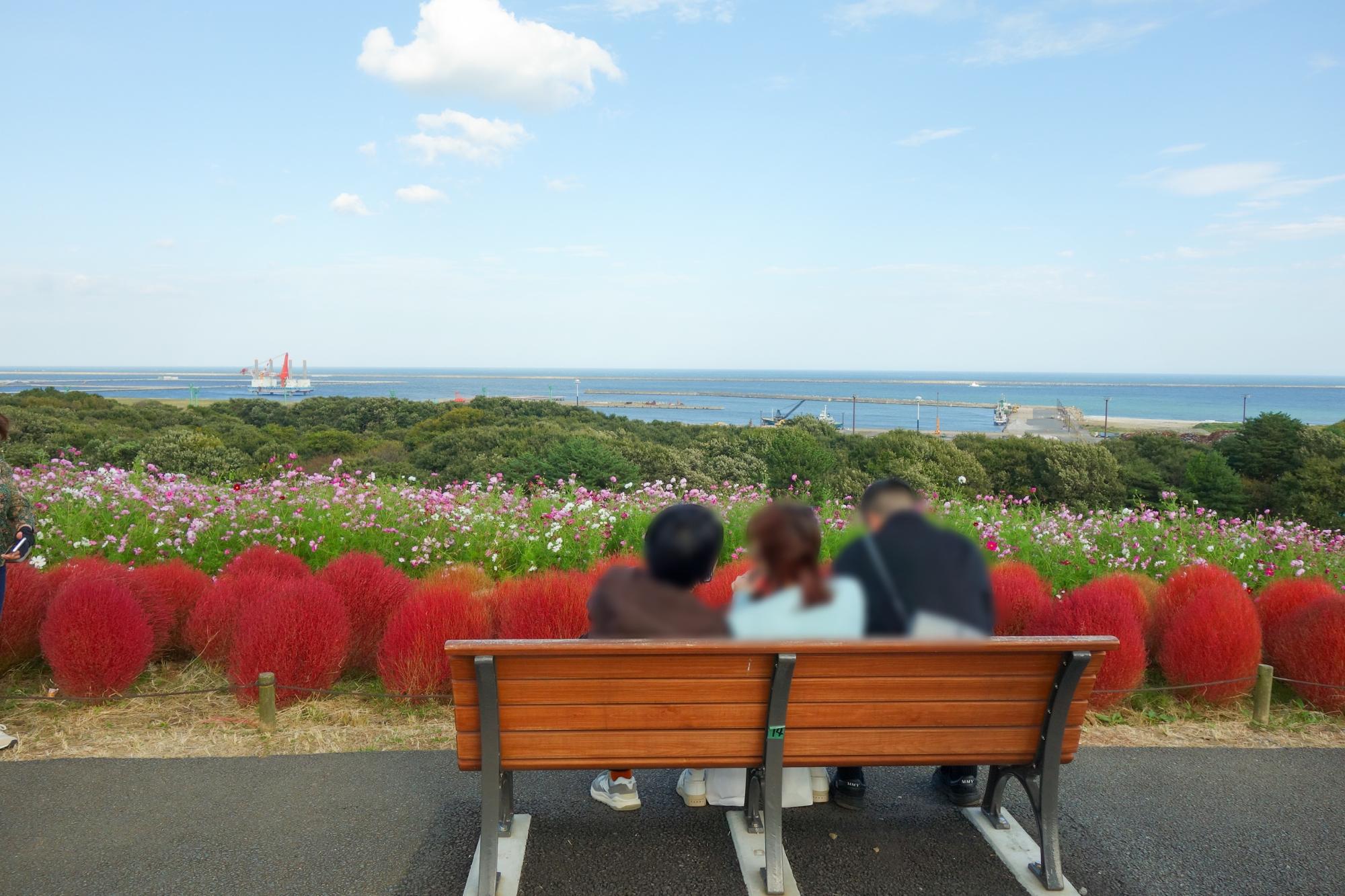 海とコスモス、コキアをゆっくり眺められるベンチ。
