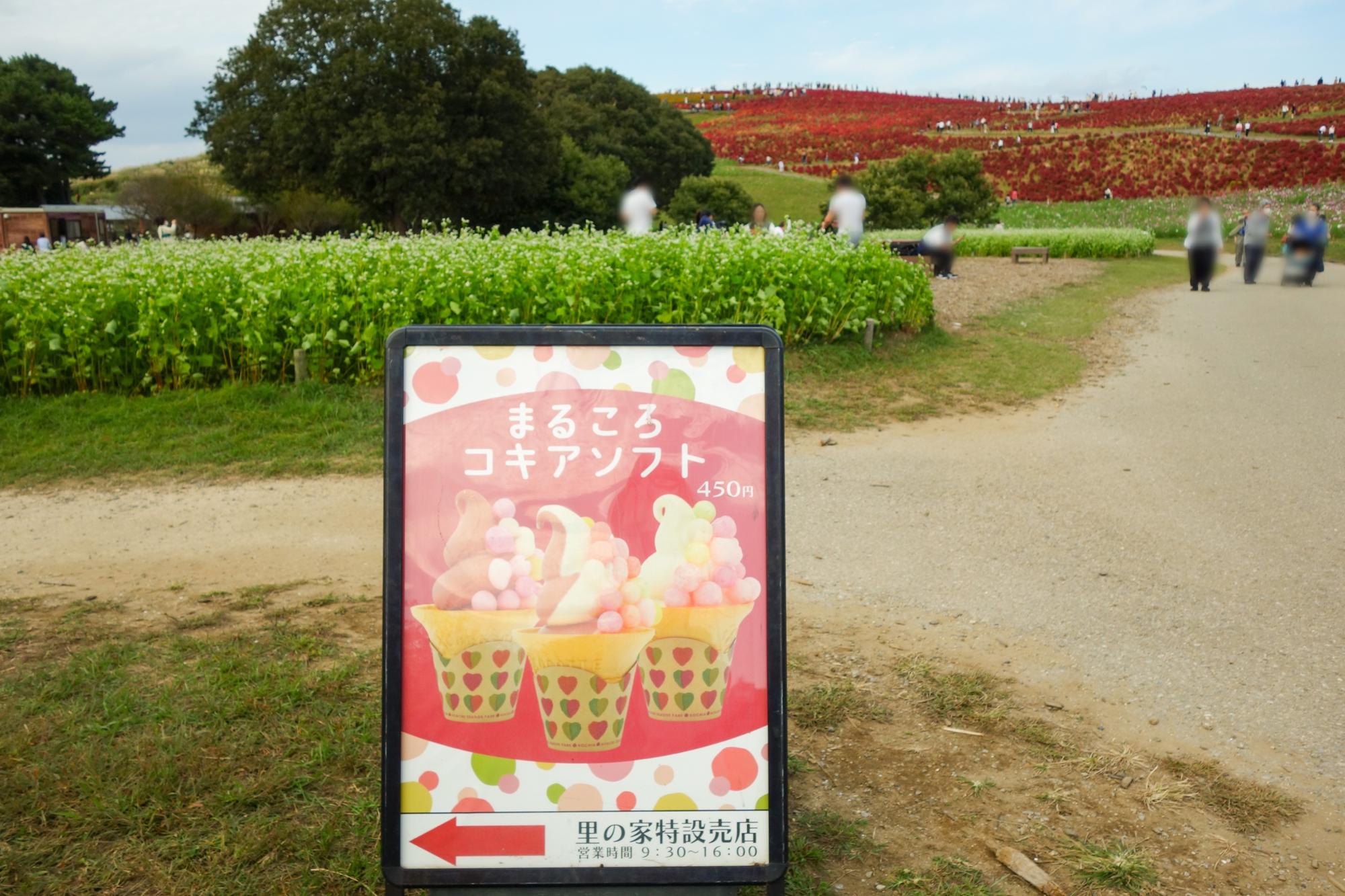 丘の頂上までのぼり、また撮影しながら休憩所までおりてきたところで、休憩を兼ねて「まるころコキアソフト」でエネルギー補給。
