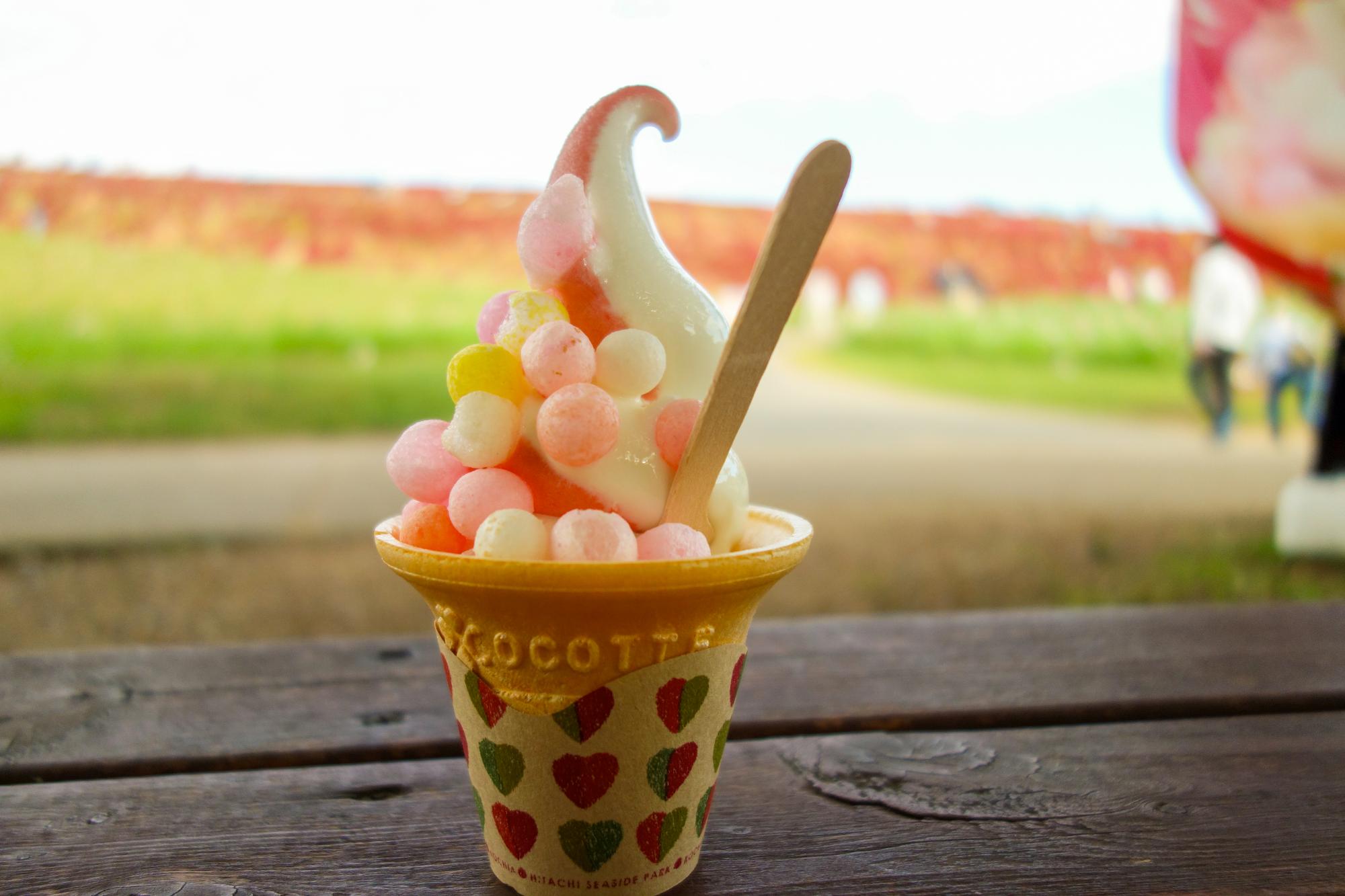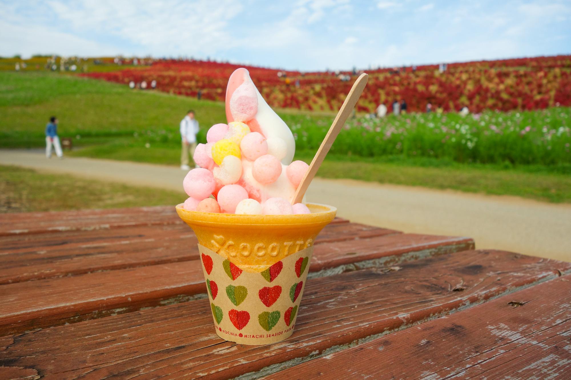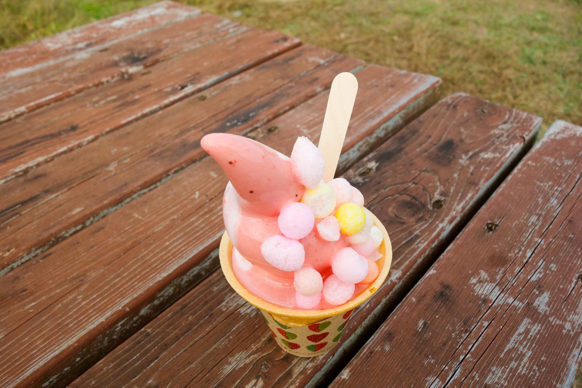 両方の味見をしたい欲張りなわたしは、ミックスを注文しました。まんまるでころころとかわいいコキアを思いだすような、丸みをおびたソフトクリーム。