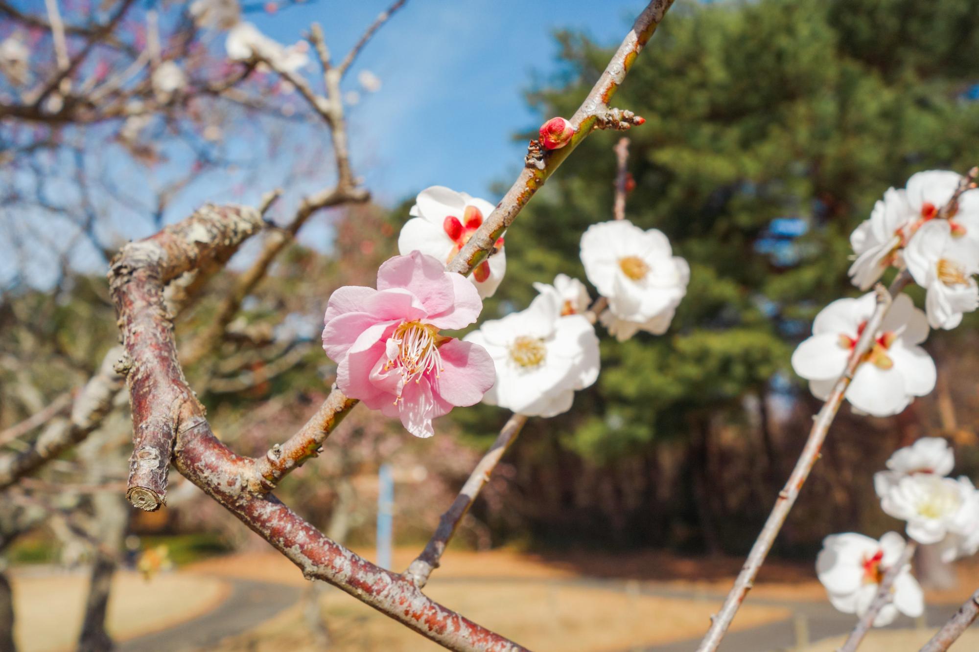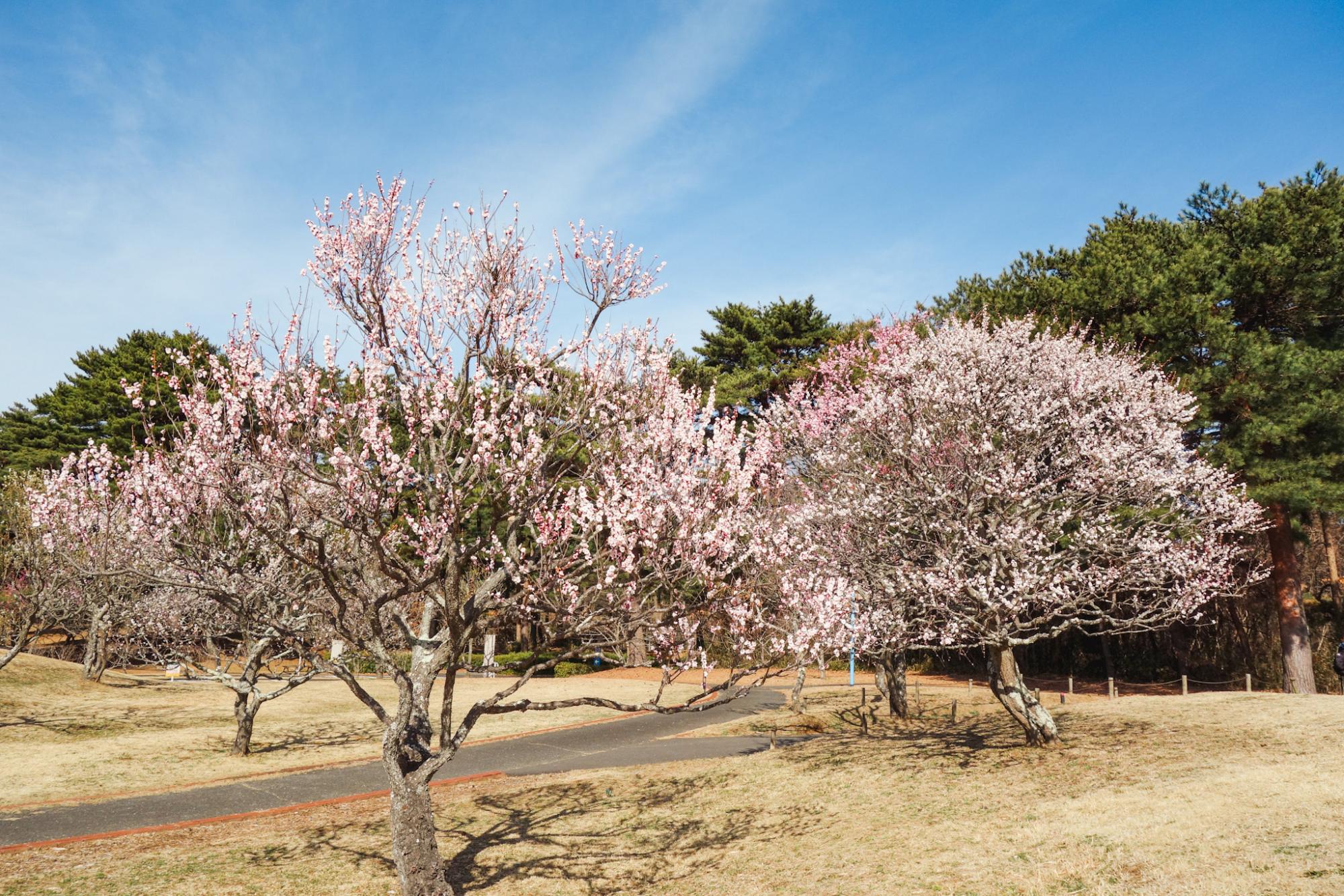 国営ひたち海浜公園では、ウメの花が見頃を迎えています。西口エリアのスイセンガーデン周辺で観梅でき、見頃は3月中旬まで。