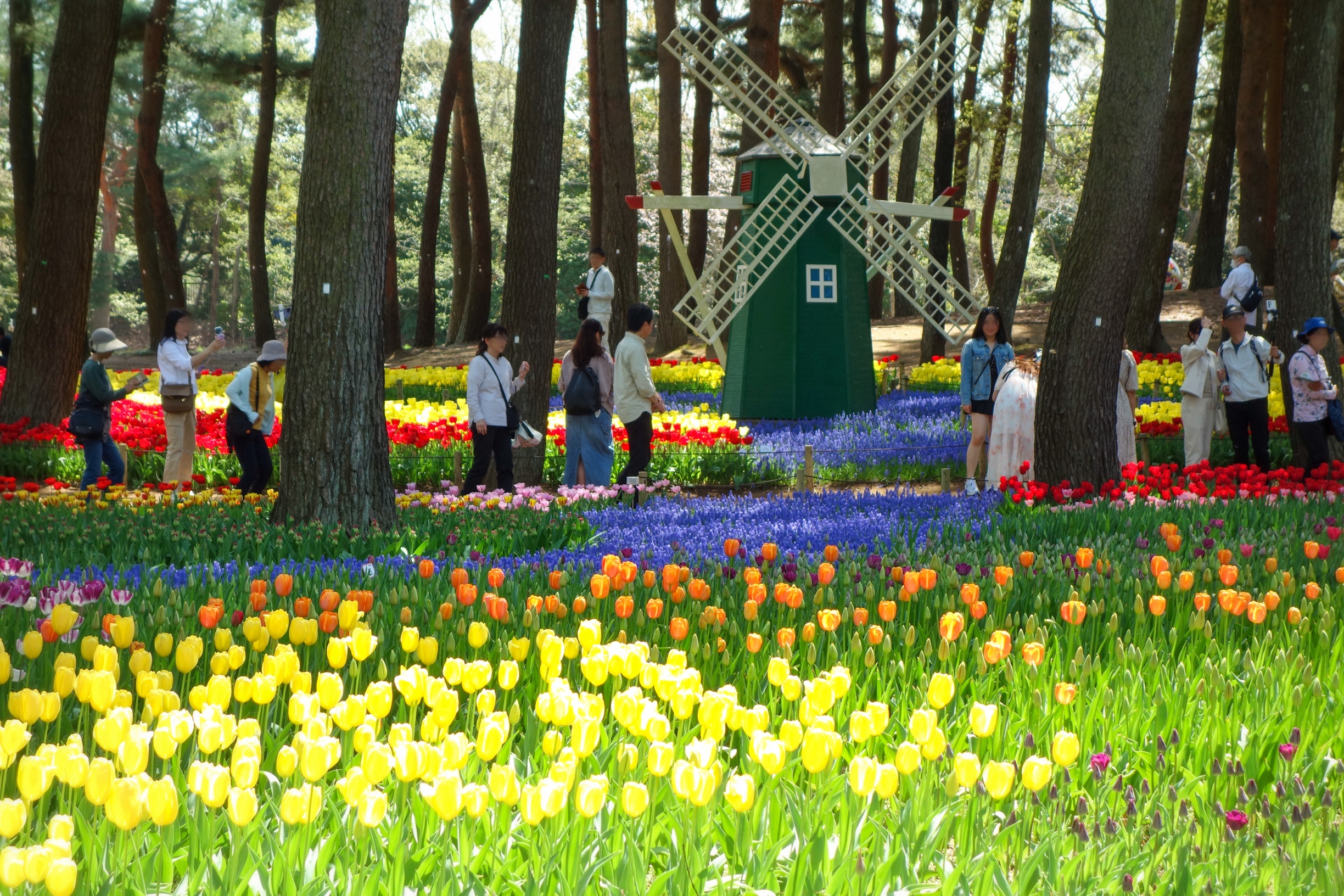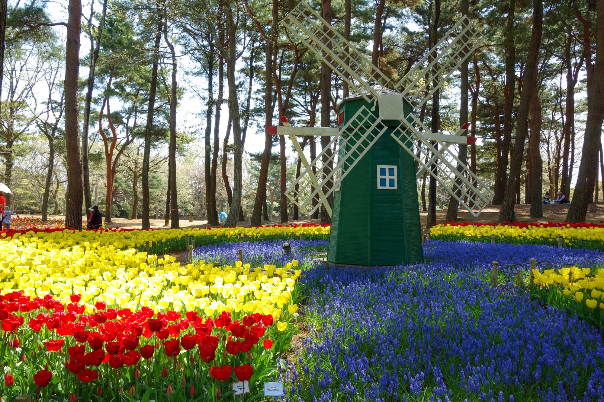 「オランダを思わせる風車の周りは見ごたえがあります。木漏れ日を浴びて輝くチューリップとの饗宴が撮影スポットとして人気を集めています。