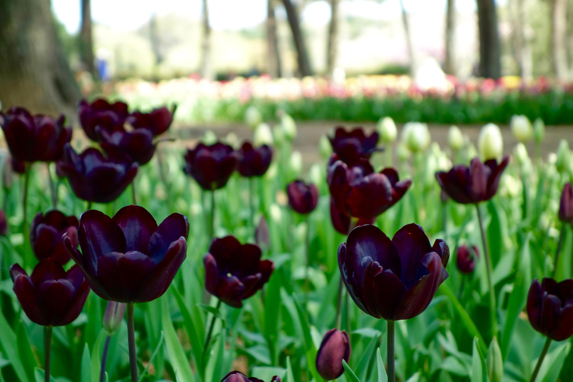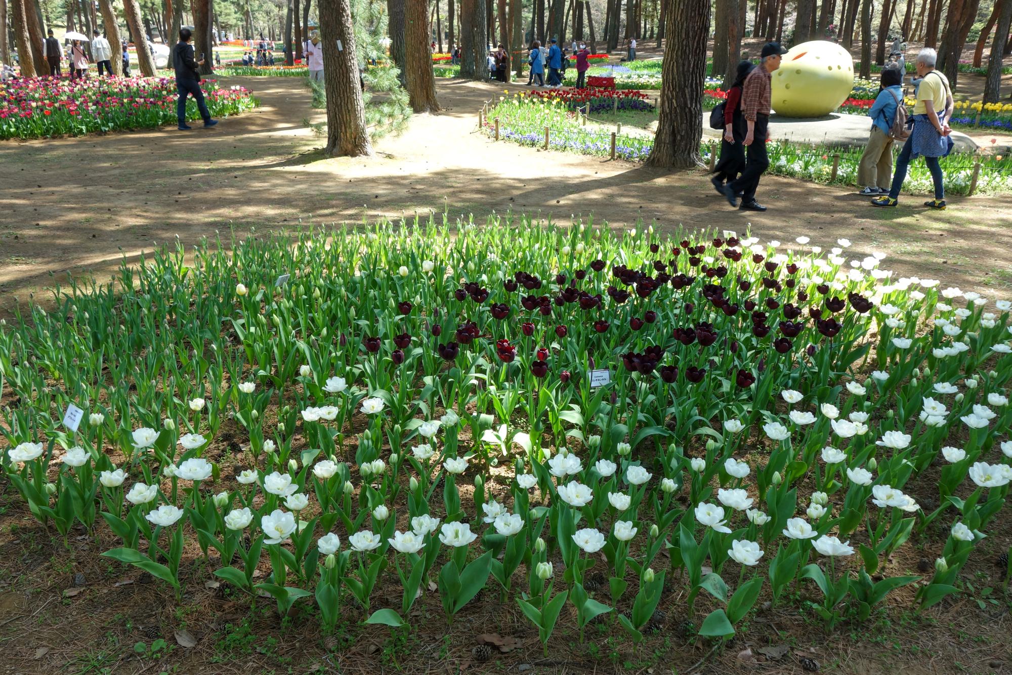 「黒(濃い紫)と白系でまとめたエリアもあります。黒いチューリップは珍しいと思います」