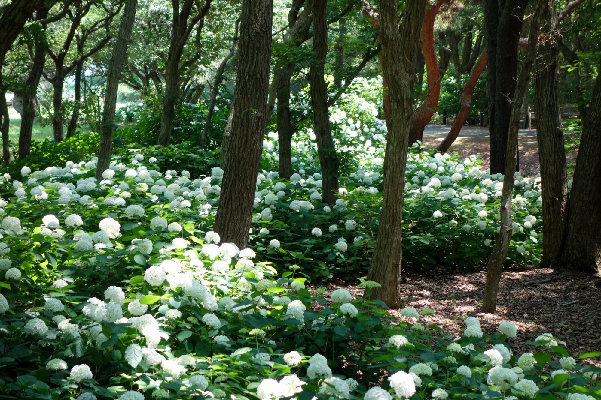 国営ひたち海浜公園の「ひなの林」では、約550株のアジサイ “アナベル” が見頃を迎えています。