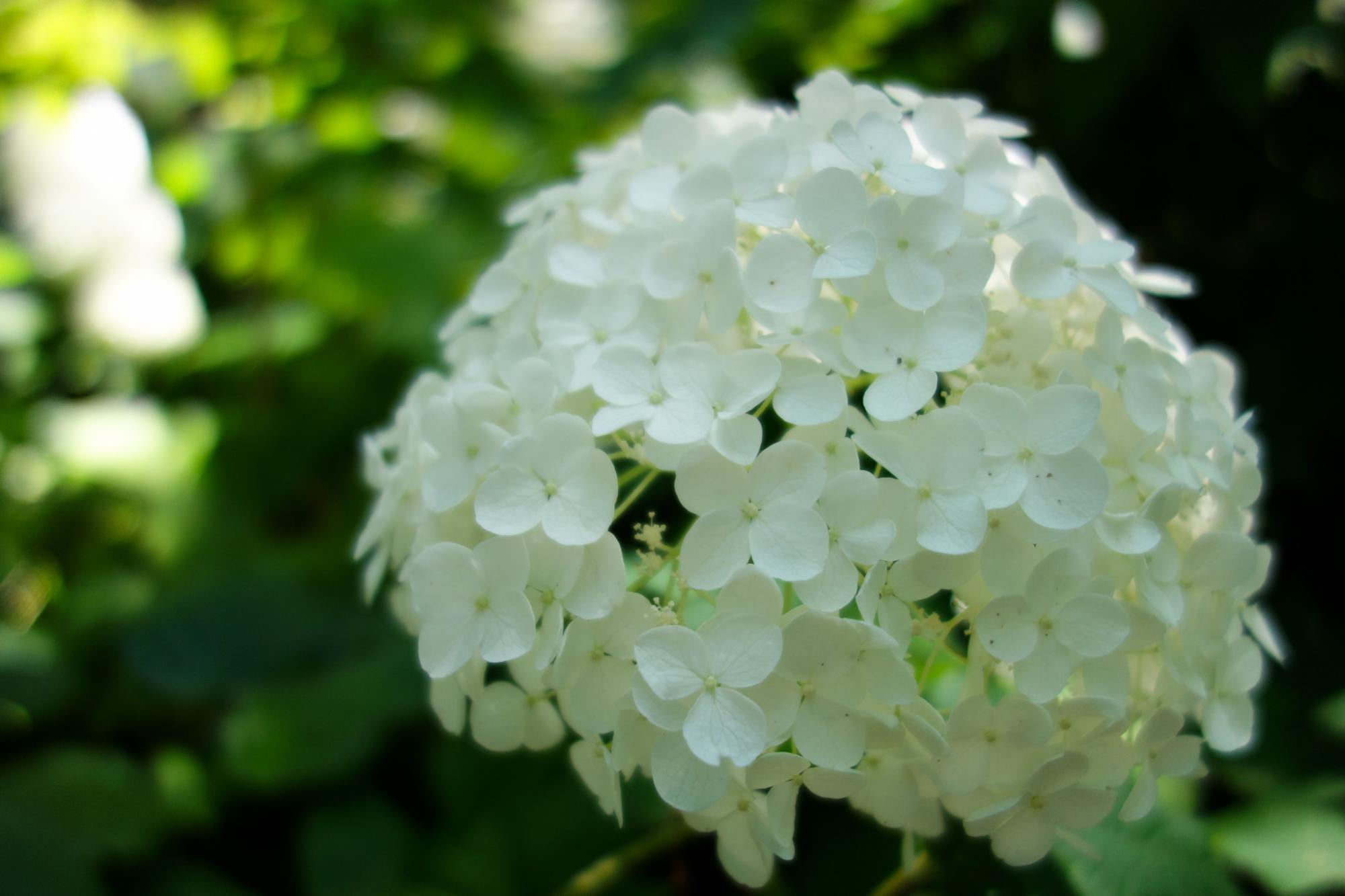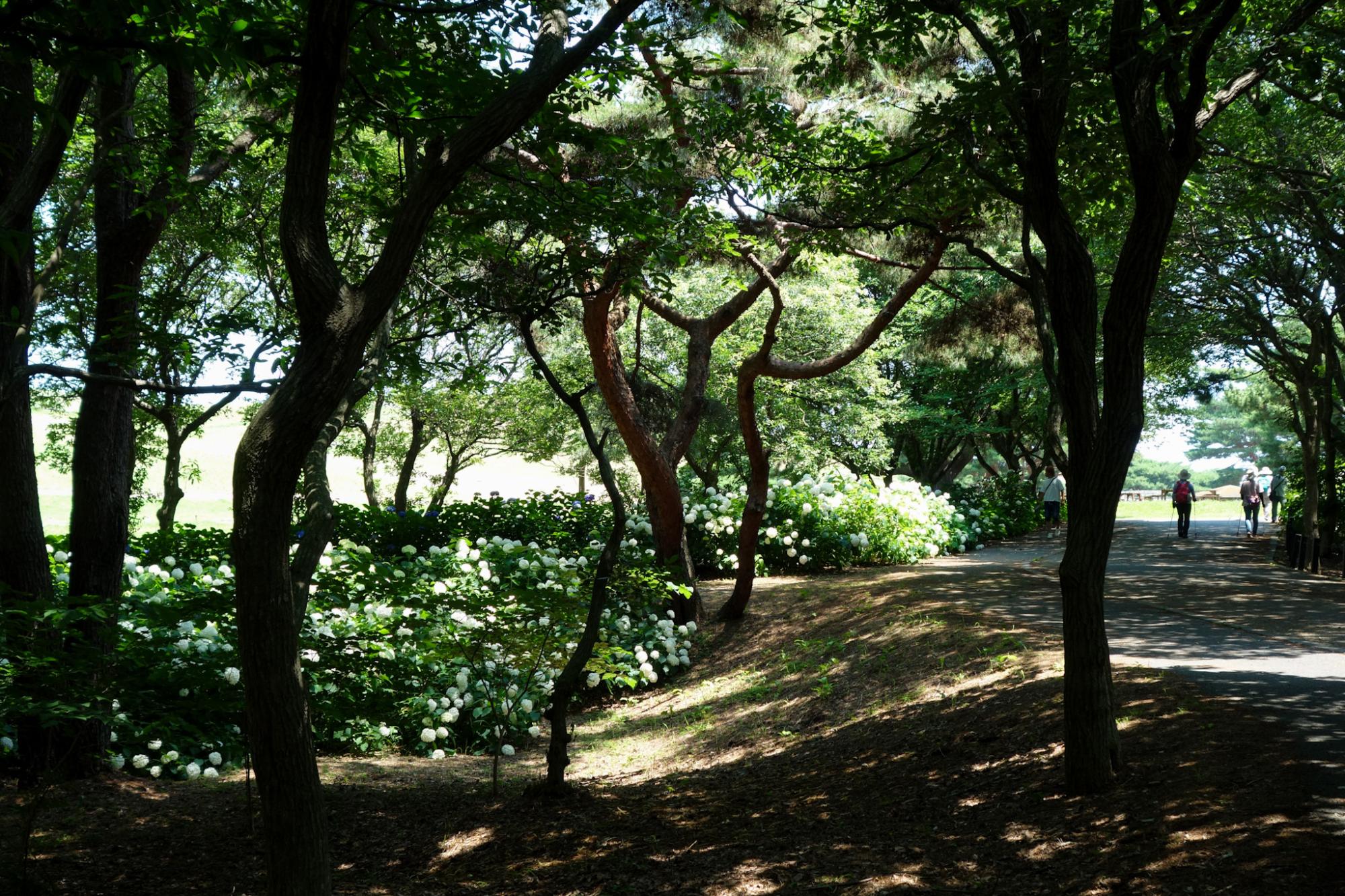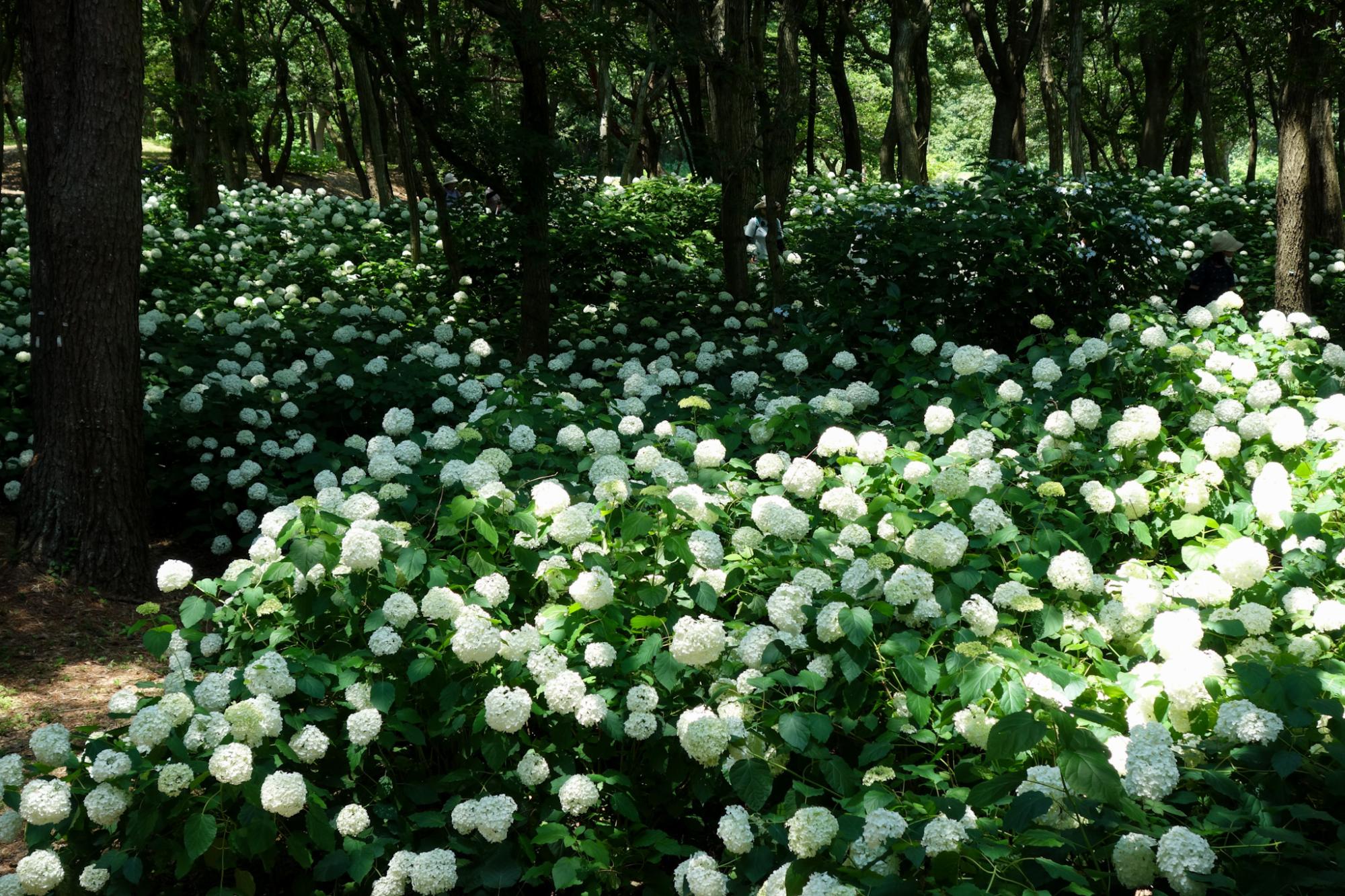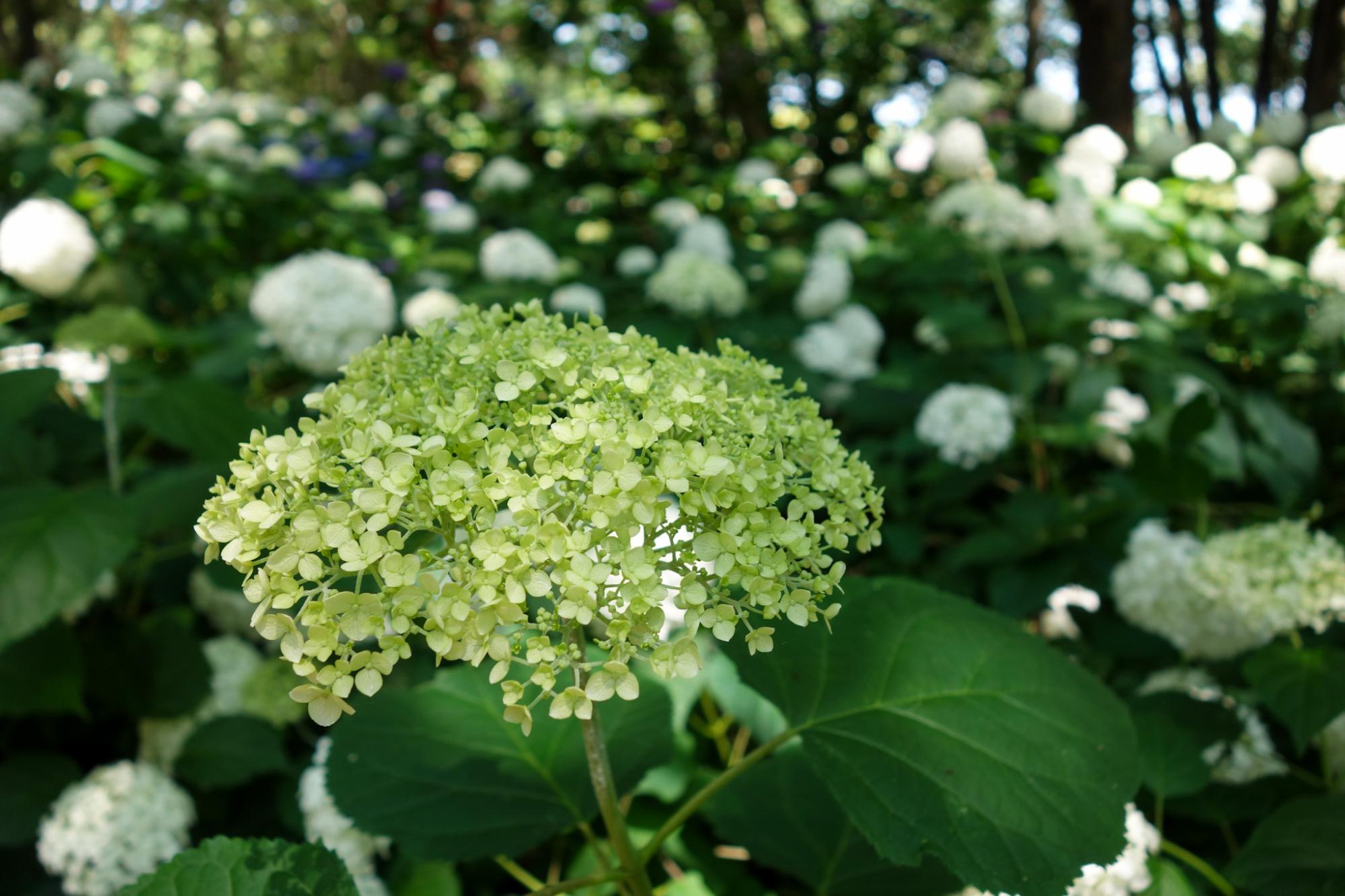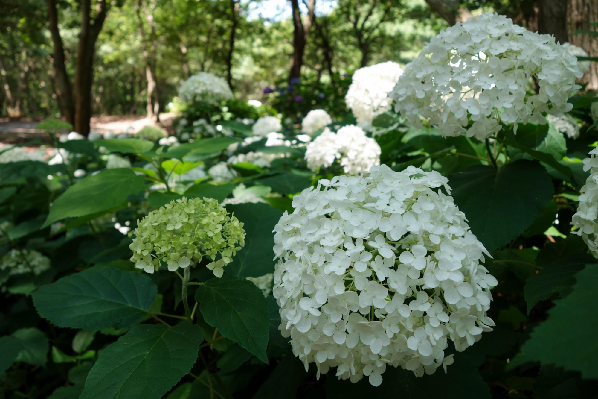 【ひたちなか市】緑から純白へ色が変わるアジサイ|木漏れ日の中で森林浴を楽しみたい