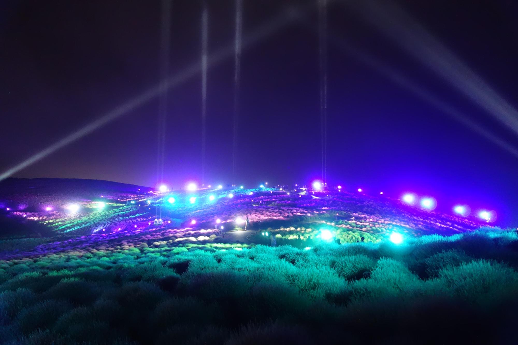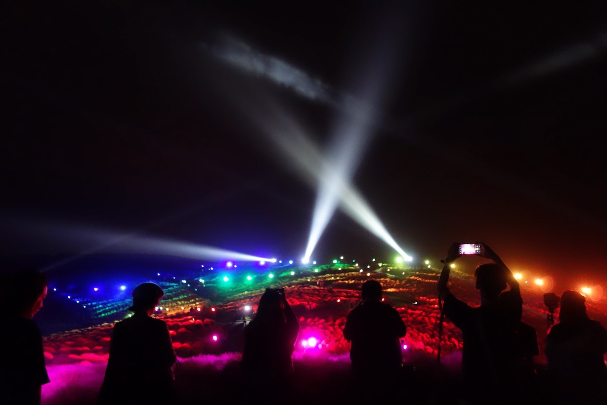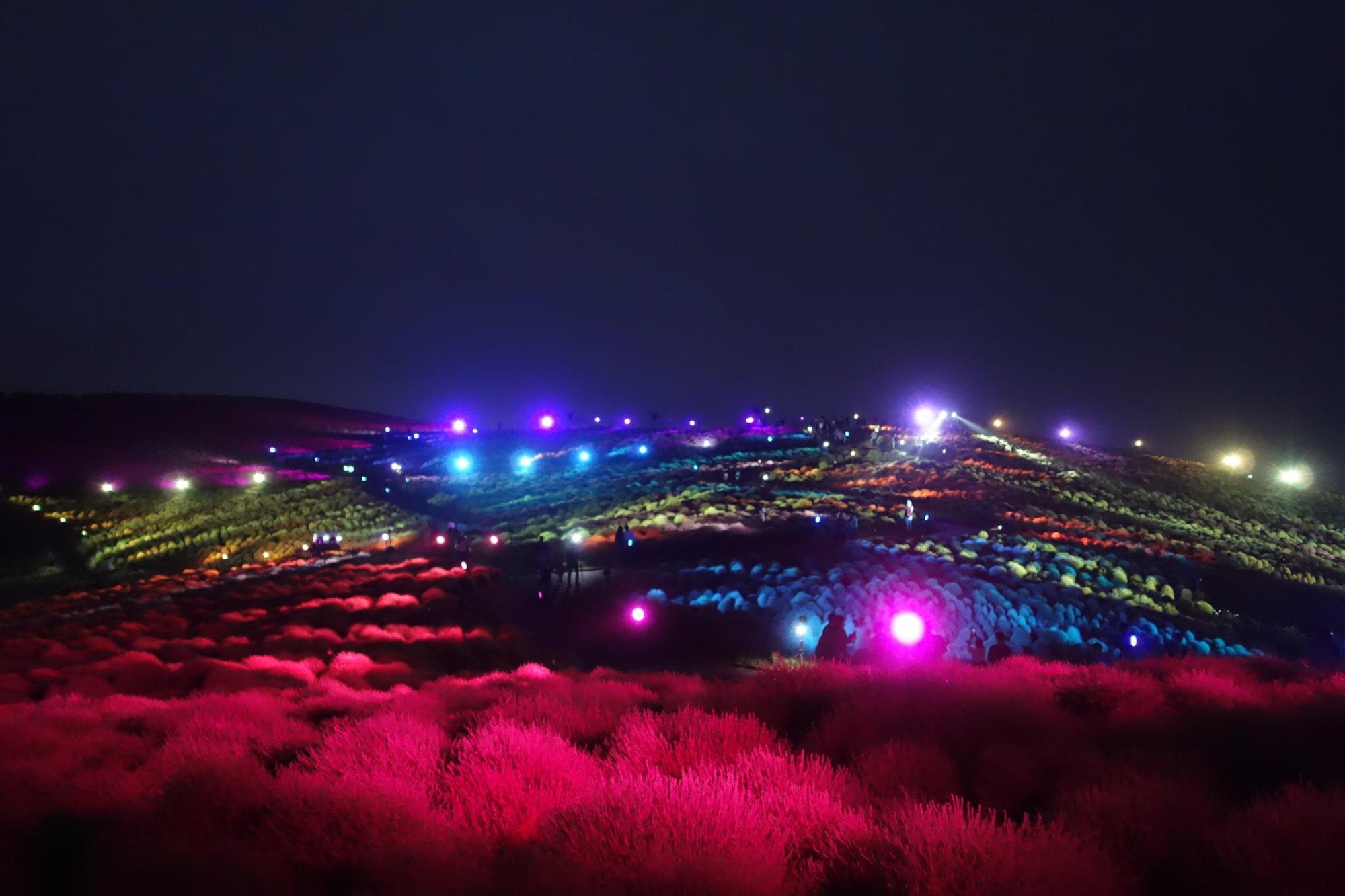 今年で9回目を迎えるコキアライトアップでは、約4万本の緑色のコキアが色とりどりのライトに照らされ、幻想的な夜景が広がります。