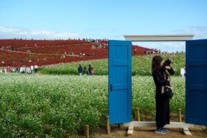 今年は、昨年展示された「ネモフィラの咲く丘で」に加え、新作「コキアが赤く染まる頃に」が展示され、訪れる人々の目を引いています。