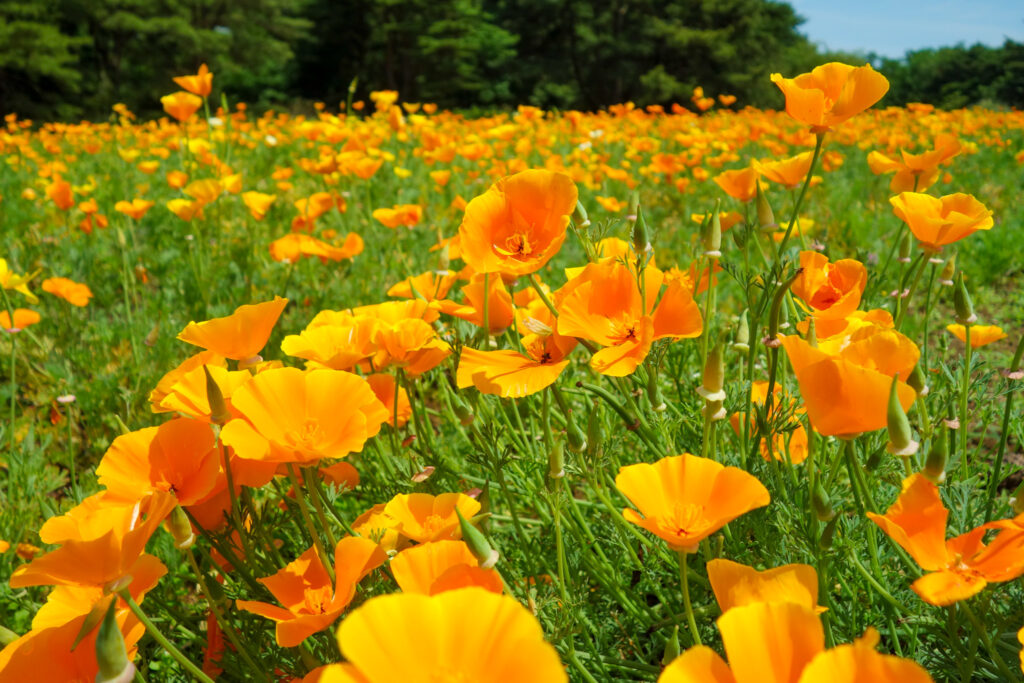 【ひたちなか市】初夏の風にオレンジ色の花びらがそよぐ|朝晩に開閉を繰り返すカリフォルニアポピーの花畑